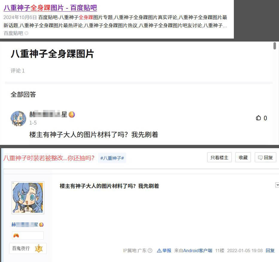 百度推荐搜索“八重神子全身踝图片”,找到了相关结果(图1),点开好像是有网友在聊这个(图2),但实际上找到这名网友当时实际的帖子却与这个关键词毫无关系(图3)。