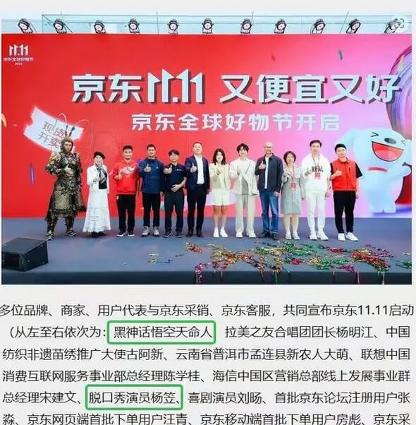 但紧接着,«黑神话悟空»宣布了和京东联动,京东还发布了一张«黑神话悟空»主角“天命人”与杨笠同台的合影。